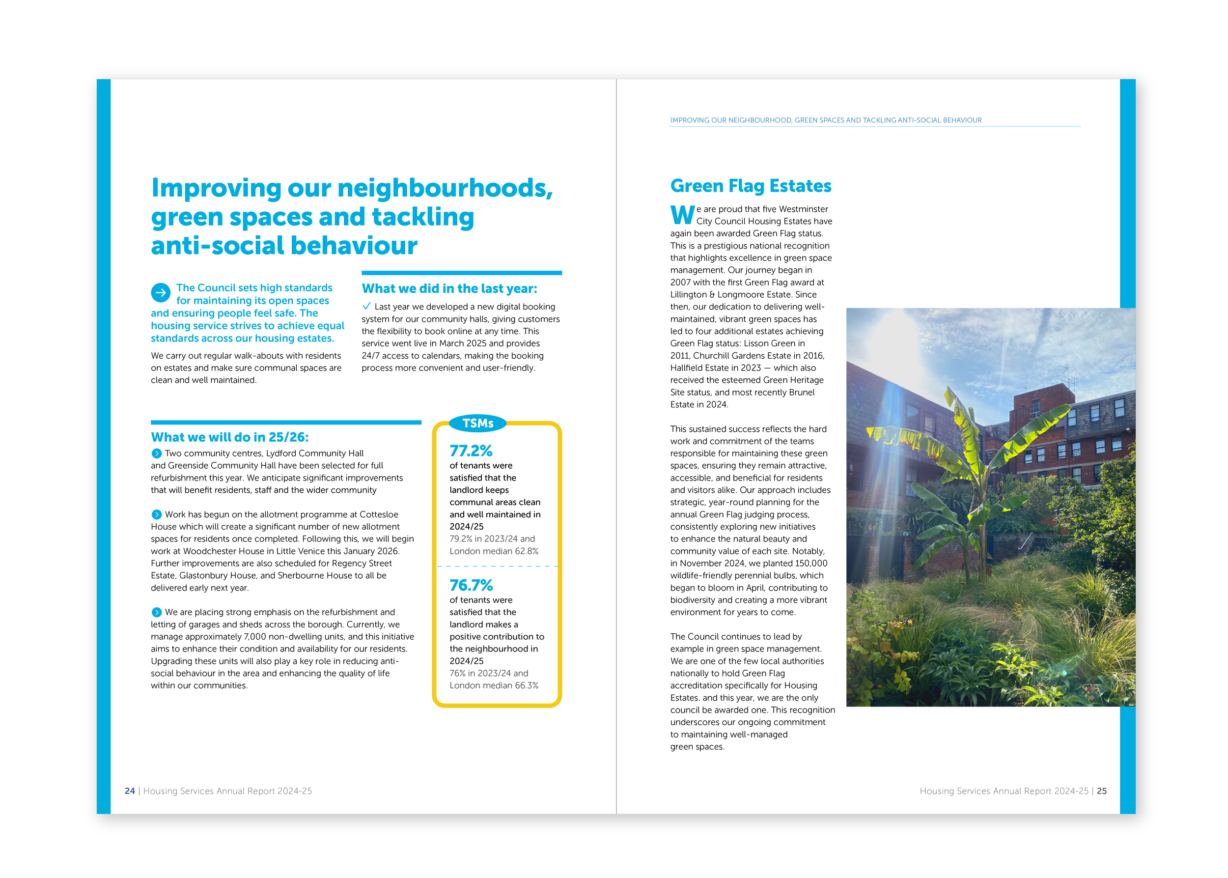 The layout prioritises breathing space while distilling complex data, such as resident satisfaction measures and housing sustainability goals, into clear infographics. This approach ensures that the services mattering most to residents remain at the forefront, reflecting the positive strides the Council continues to make for the community.