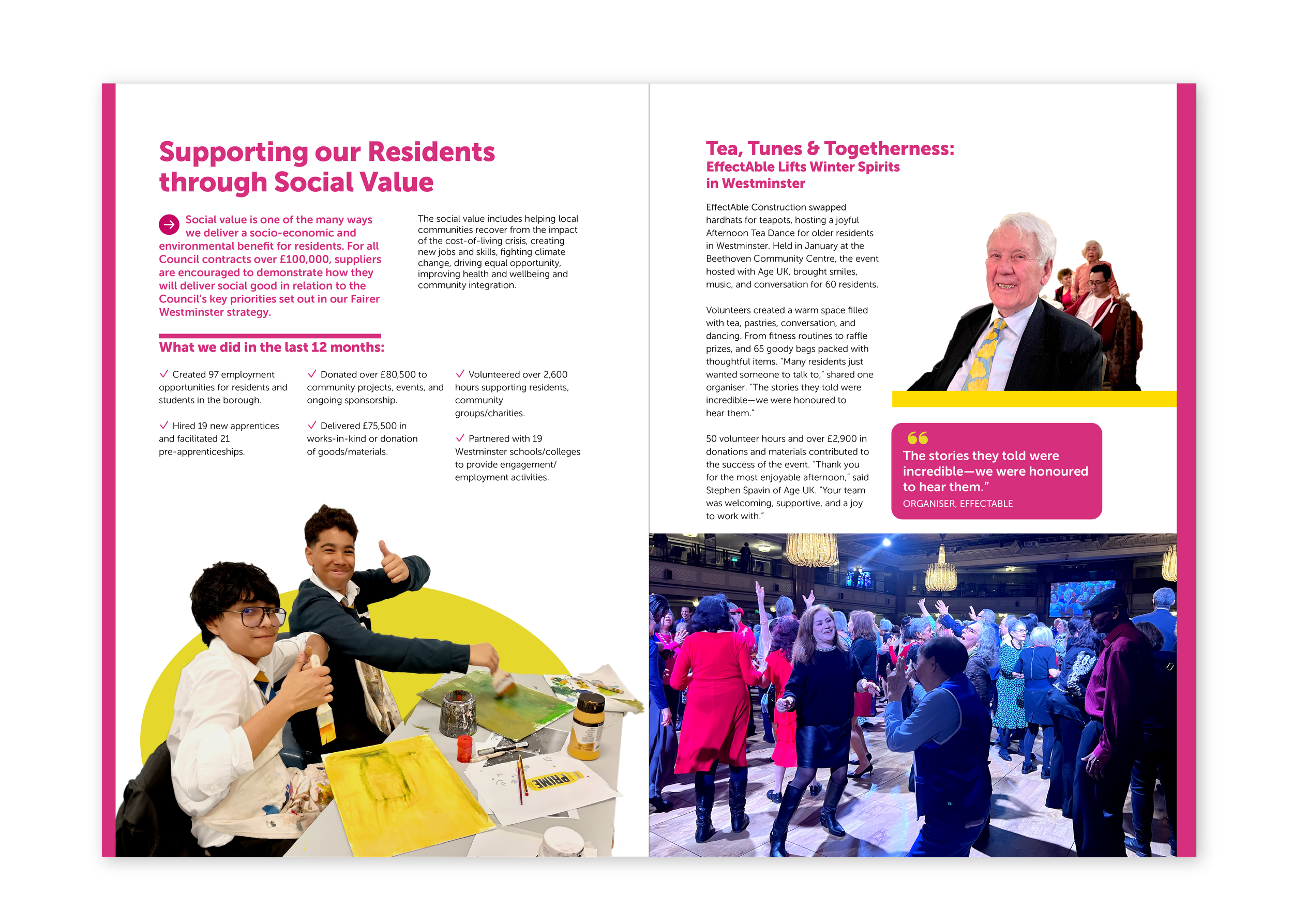 Operating as the sole designer for the project alongside the Housing Communications team and the Lead Councillor for Housing, I worked within the Fairer Westminster brand guidelines and incorporated authentic photography of residents and staff to create a vibrant reflection of the diverse area, while keeping the layout easily readable for readers.
