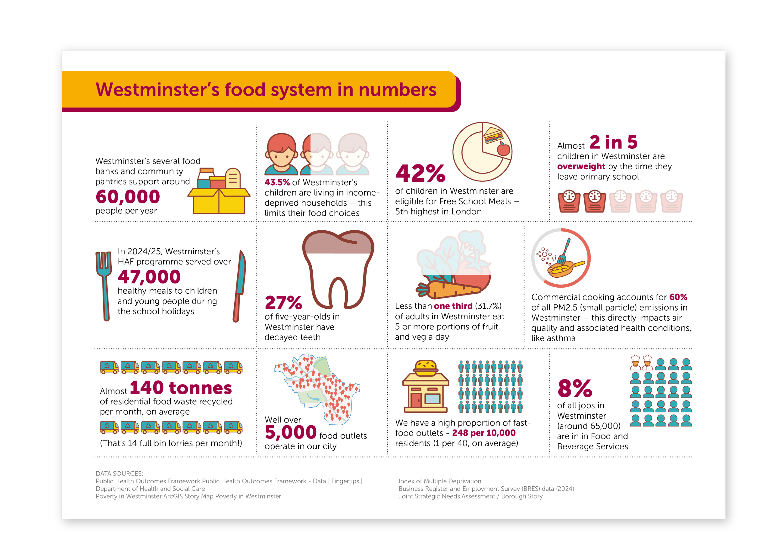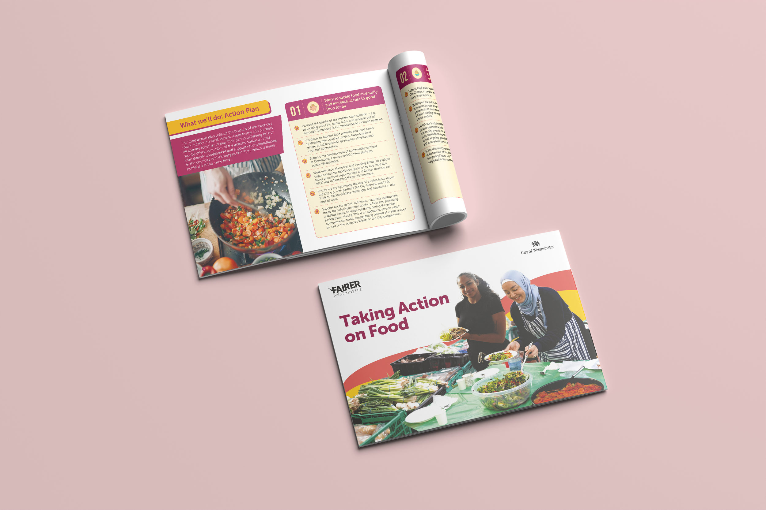 Westminster City Council asked me to design their Food Action Plan, a strategy tackling food insecurity and access to healthy, sustainable food across the borough. I worked within the Fairer Westminster brand, using a vibrant colour palette and community imagery to make the content feel approachable rather than bureaucratic. The central infographic translates key statistics into visual metaphors to make the data land for a wide audience of residents and local partners.